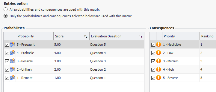 8. By default, all of the probabilities, consequences, and severities defined for the site are used in the risk matrix. To limit the values, click Only the probabilities and consequences selected below are used with this matrix. On this and the Severities tabs, a selection check box becomes available for each option. For example:On the General and Severities tabs, clear the items that you want to exclude from the matrix. Ensure that you have selected as many severities in each category as there are selected consequences.