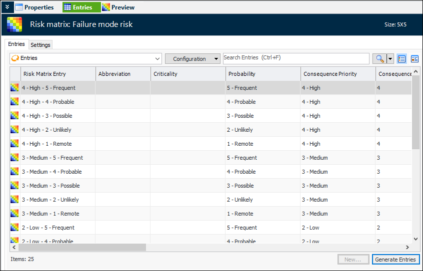 16. On the Entries tab, you can now open each new entry to set its color or adjust its label. See To Work with a Risk Matrix Entry for information about setting entry properties.