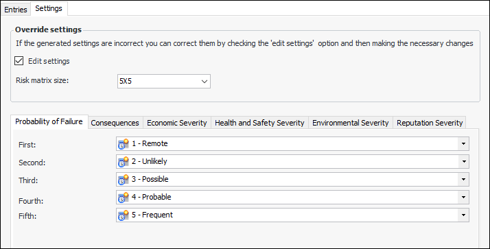 17. Select the Settings tab if you wish to edit probabilities, consequences, or severities. Select Edit settings.To Work with a Risk Matrix Entry