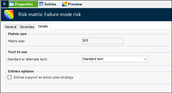 11. Select the Details tab.The Matrix size value is updated when the entries are generated. The first number is the quantity of probability values. The second number is the quantity of consequences.