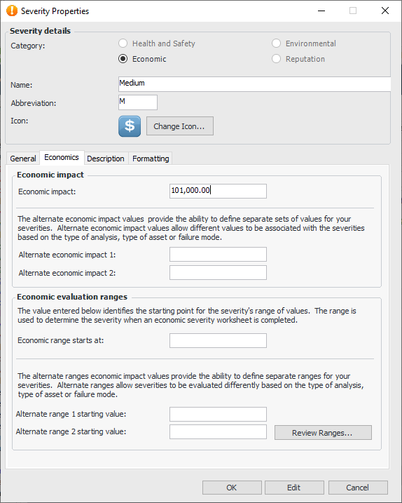 15. Select the Economics tab. If you are creating an economic severity, the Economic evaluation ranges area is available on this tab. For example: