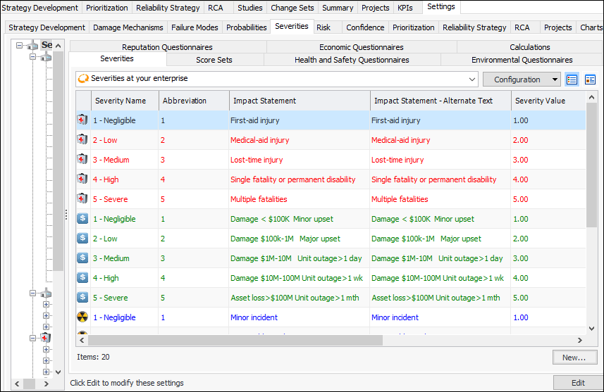 1. On the site’s Strategy Development view, select the Settings tab, the Severities tab, and the Severities settings node in the tree.Tip: You can also select the site’s Administration menu, Strategy Development Settings, Risk Analysis and then Severities. The Strategy Development - Severities Settings dialog appears.