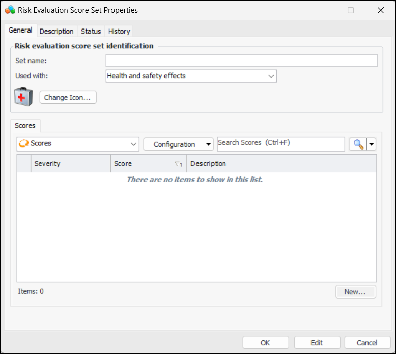 3. Click New. The Risk Evaluation Score Set dialog appears. For example: