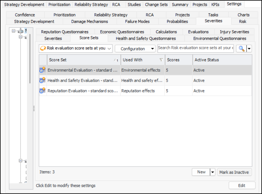 1. On the site’s Strategy Development view, select the Settings tab, the Severities tab, and the Severities settings node in the tree.Tip: You can also select the site’s Administration menu, Strategy Development Settings, Risk Analysis and then Severities. The Strategy Development - Severities Settings dialog appears.