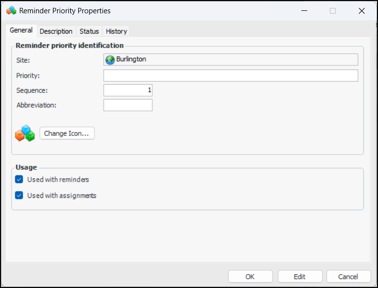 7. If you wish to change the graphic that represents the priority in tables and charts, click Change Icon, select a different graphic, and click OK.