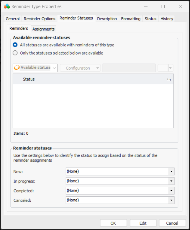 12. In the Reminder statuses area, select statuses to be assigned to reminders when their assignments have the status New, In progress, Completed, and Canceled. For example, when an assignment is marked as “Canceled”, you could specify that the reminder also be canceled.