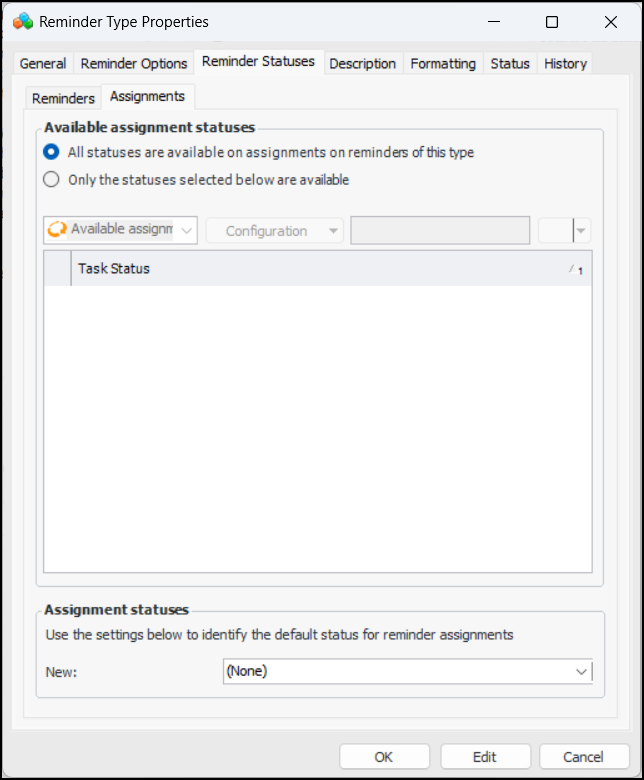 10. Select the Reminder Statuses tab. On the Reminders tab, you can restrict the statuses available on reminders of this type. You can also set the reminder status based on the status of its assignments.