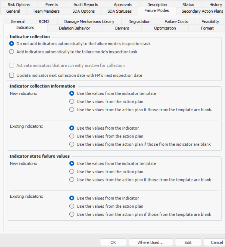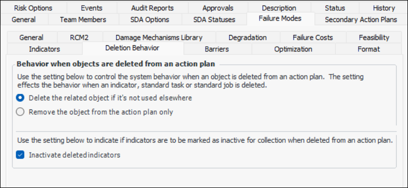 4. For RBI analyses, you can select Update indicator next collection date with FM’s next inspection date. Analysts can calculate the next inspection date on a failure mode and then update the indicators’ next reading dates. Indicators are updated when the action plan is marked “Facilitation Complete”. On the indicator, “Next reading due” is set to the failure mode’s next inspection date. The Next reading date source box displays “Failure mode degradation rate”.To Set Deletion Behavior Options
