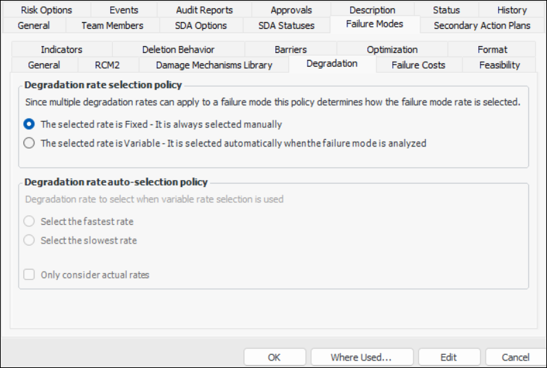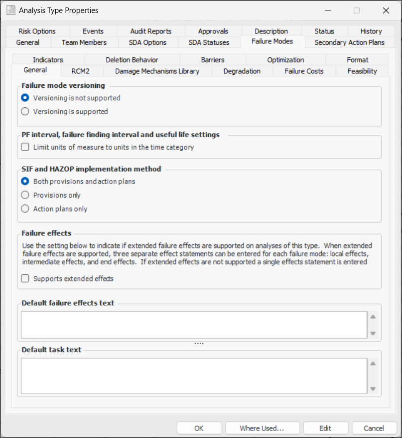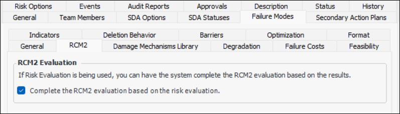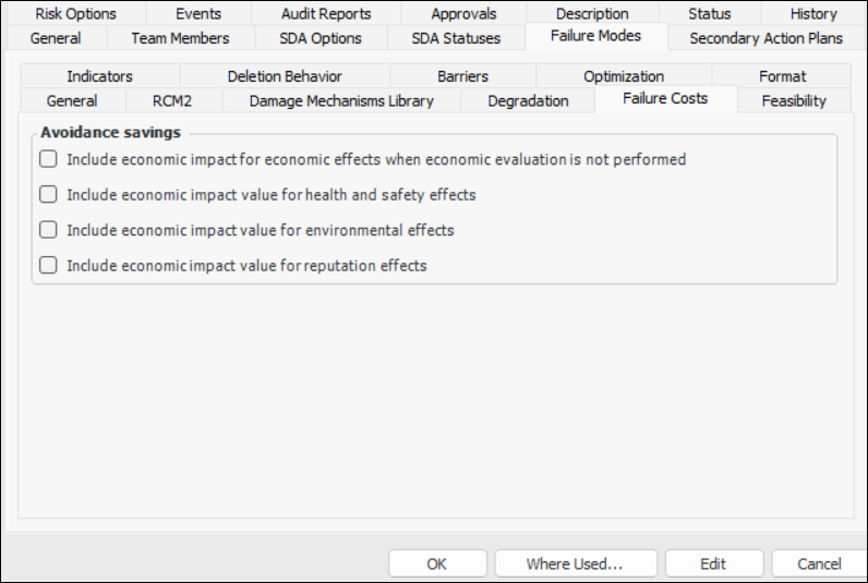 Note: The tabs and options available vary depending on the kinds of analysis that the type works with. For example, if the analysis type supports CPR only, the Failure Costs tab is not available. This topic assumes that all analyses are selected except prioritization and condition analysis.This topic explains how to set the failure mode options for an analysis type. These options include:Note: For each of the severities defined for Health and Safety, Environmental, and Economic consequences, be sure to set the RCM2 option appropriately. As an example, for the “Severe” health and safety severity, select Represents Health and Safety consequences for RCM2 purposes. For the “Low” health and safety severity, clear this option.