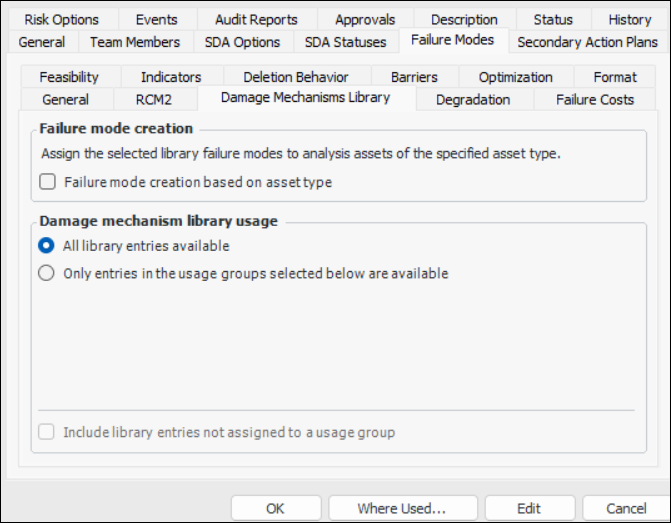 2. To limit the use of library failure modes to assets of the type specified in the library entry, select Failure mode creation based on asset type. The library failure mode’s usage options specify the appropriate asset types for the entry. This means that when a library failure mode is added to an RBI analysis, it is assigned to analysis assets of the specified type(s).