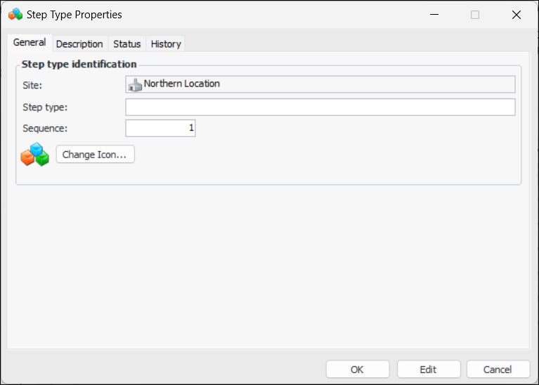 7. Select the Description tab to add information about the step type.The Status tab displays information about the step type’s active status. The History tab displays information about the step type’s creation and update history.
