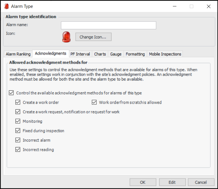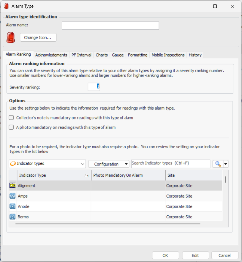 If you wish, you can change the icon used for the alarm type. This is the icon that will appear in the site’s Indicators view when an asset has an indicator with an alarm turned on.