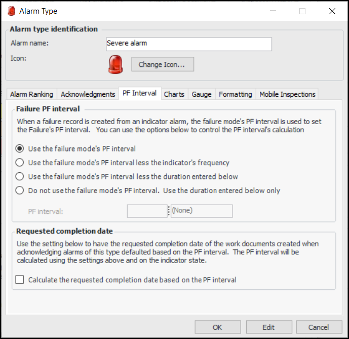Note: The alarm type’s rule for setting the failure’s PF interval can be overridden on the indicator state, where a PF interval can be entered directly. For more information, see Adding States and Alarms to an Indicator or Template.