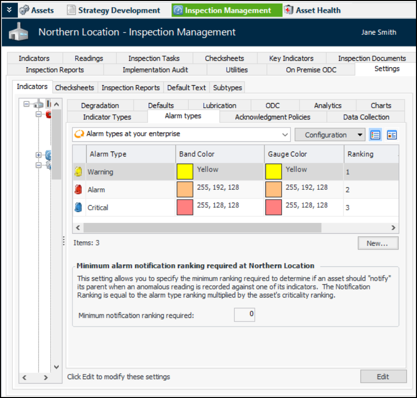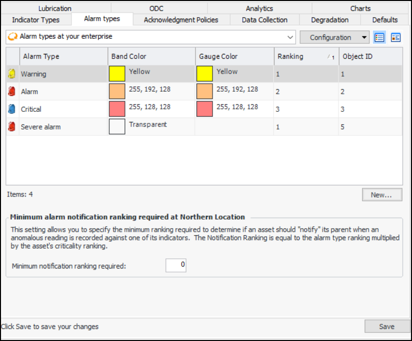 The minimum alarm notification ranking allows you to determine whether or not indicator alarms are displayed on parent assets. APM calculates the notification ranking for each alarm by multiplying the alarm type’s ranking with the asset’s prioritization ranking. For more information, see Alarm Notification.To Set up Alarm Types