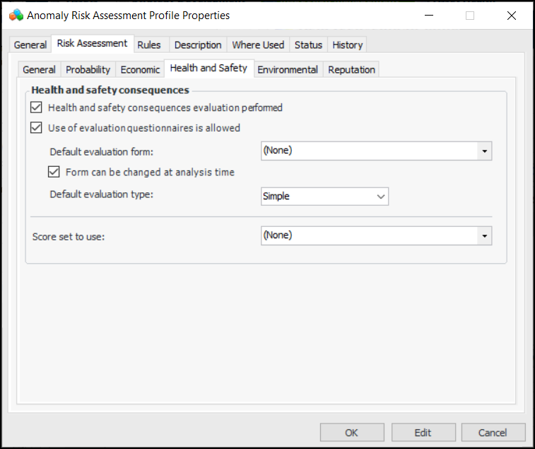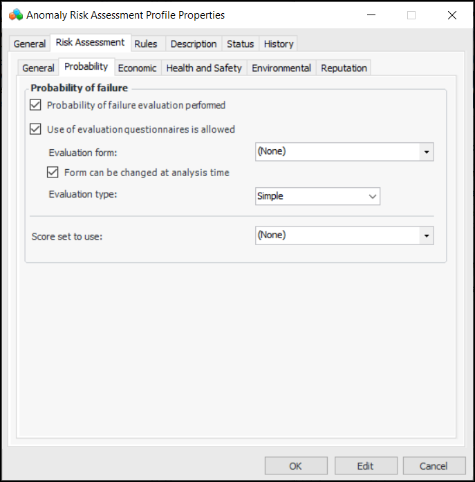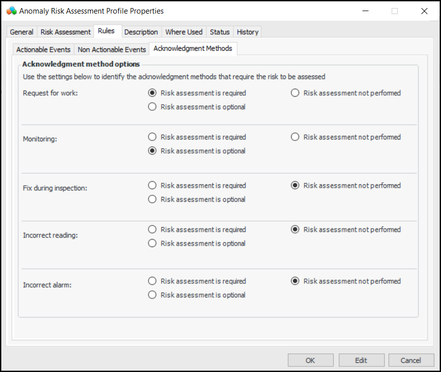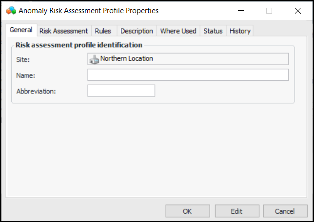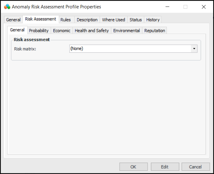 6. In the General tab, select a risk matrix to use with assessments. The list contains only matrices that have been set to use anomaly risk assessment. For more information, see Setting up Risk Matrices.