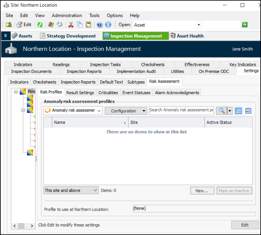 1. From the Site window, select the Inspection Management view and the Settings tab. Select the Risk Assessment tab and the Risk Assessment Management Settings node in the tree.Tip: You can also select the Performance Management or Work Management view and then the Settings tab.