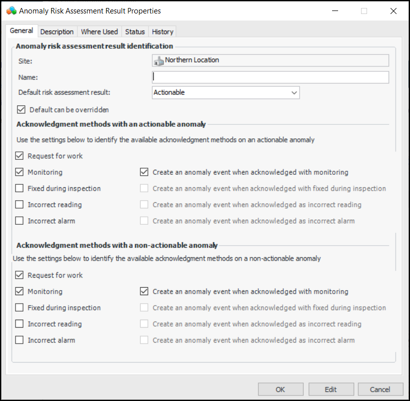 9. Select the Description tab to add more information about the result.The Where Used tab will list the failure criticalities the result is used.The Status tab displays whether the result is active or inactive, as well as the active status history.The History tab shows when the result was created and last changed.