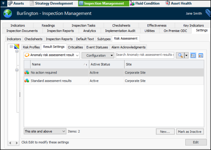 1. From the Site window, select the Inspection Management view and the Settings tab. Select the Risk Assessment tab and the Risk Assessment Management Settings node in the tree.Tip: You can also select the Performance Management or Work Management view and then the Settings tab.