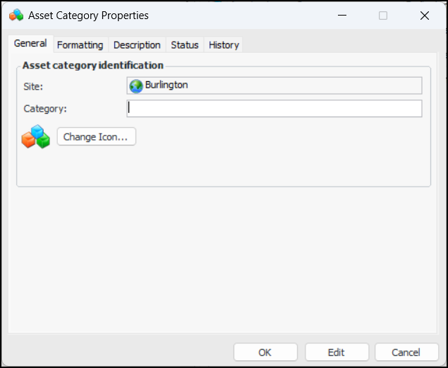 3. Click New. The Asset Category Properties dialog appears: