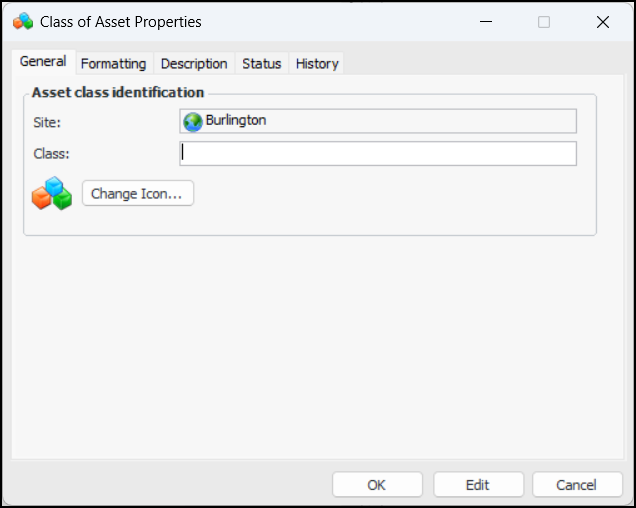 3. Click New. The Class of Asset Properties dialog appears: