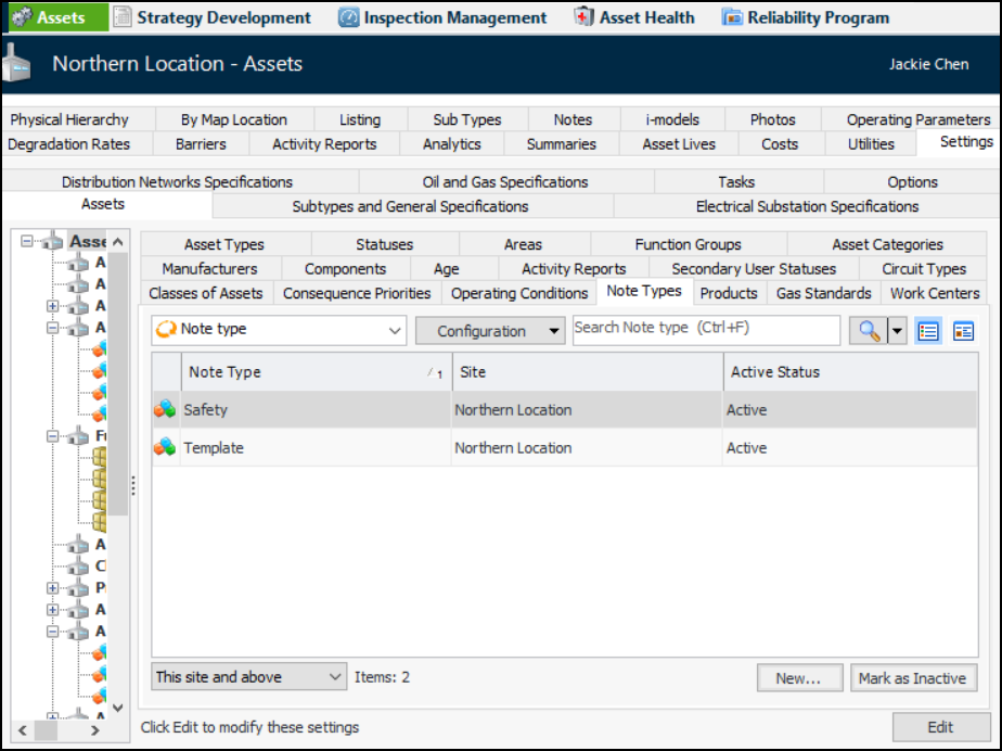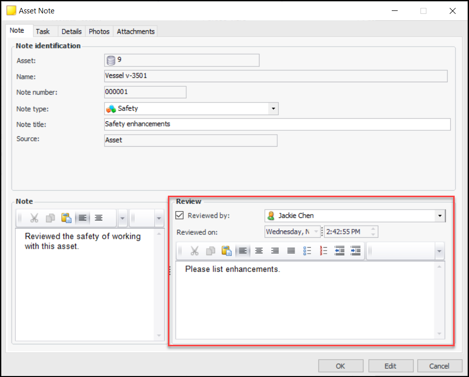 4. Notes of this type support review is selected by default. After a note has been saved, anyone can open the Asset Note window, mark the note as reviewed, and provide comments. For example: