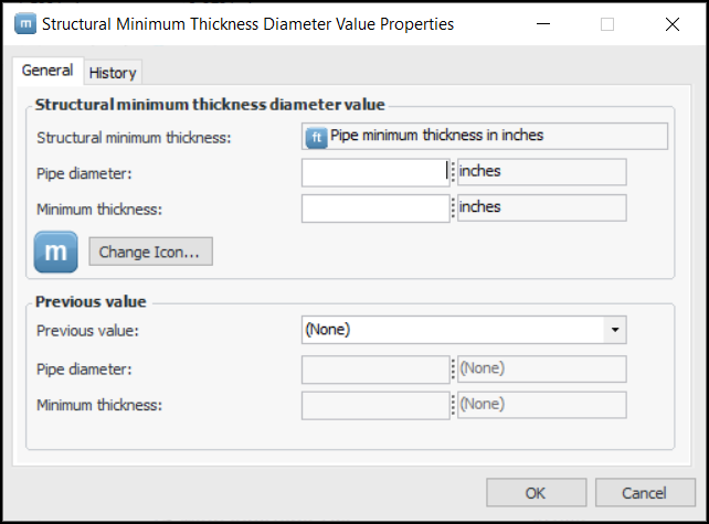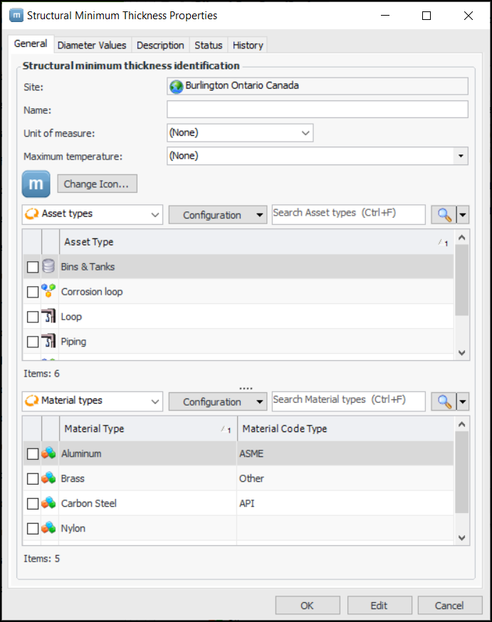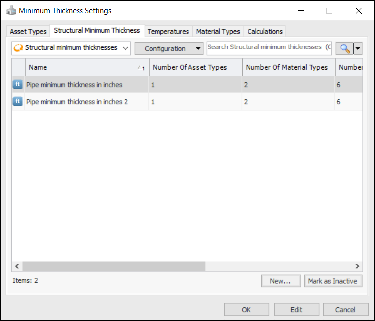 16. When you have finished entering diameter values, click OK. The structural minimum thickness table is added to the tab.The Material Types tab displays the material types supported by the enterprise.The Calculations tab displays the minimum thickness calculations supported by the enterprise. For information about creating them, see Creating a Degradation Minimum Value Calculation.