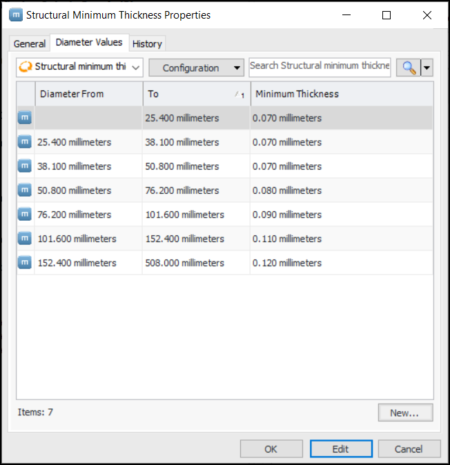 10. For each range of diameter values, click New. The Structural Minimum Thickness Diameter Value dialog appears: