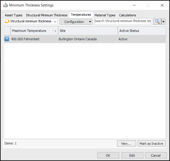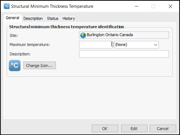3. For each temperature you wish to add, click New. The Structure Minimal Thickness Temperature dialog appears:Tip: Temperatures can be marked as inactive to prevent them from being available for selection. When you are ready to release an inactive temperature, select it in the table and click Mark as Active. In the Structural Minimum Thickness Temperature dialog, the Status tab allows you to change the active status and view the most recent active status change.