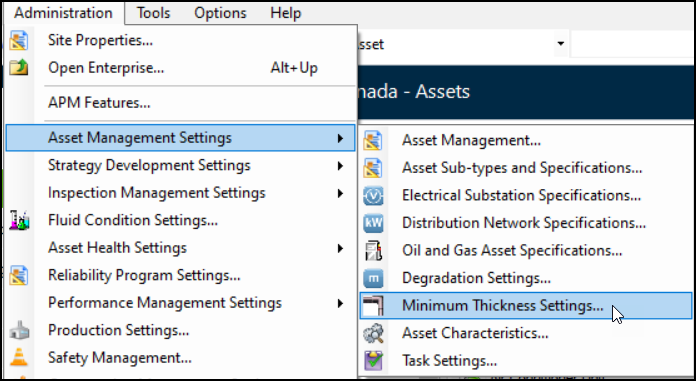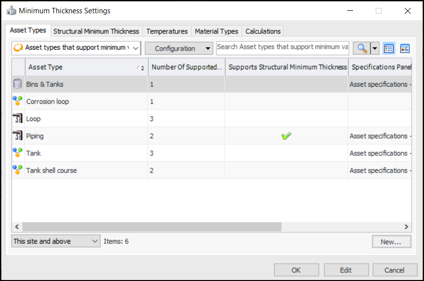 1. In the Site window, click the Administration menu, Asset Management Settings, and then Minimum Thickness Settings:The Asset Types tab displays all asset types that support minimum value calculations. You can also select the “Asset types that do not support minimum value calculations” configuration to add calculations and enable structural minimum thickness. For more information, see **Setting up Asset Types.Tip: You can also find structural minimum thickness settings in the Assets view, Settings tab, Oil and Gas Specifications tab. Select the Oil and Gas Specifications node in the tree. Select the Minimum Thickness tab.