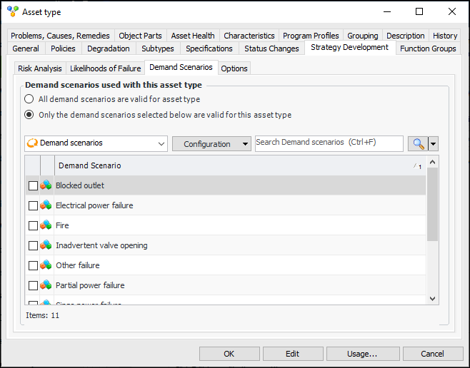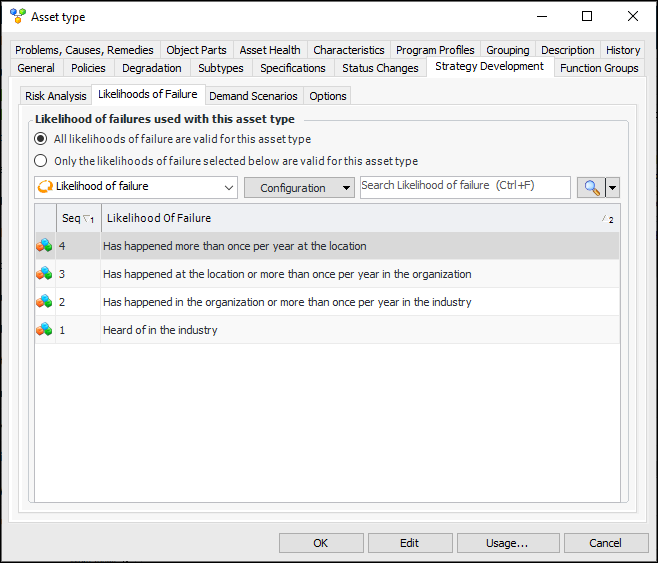 1. On the Asset Type window, Strategy Development tab, select the Likelihoods of Failure tab. By default, all likelihoods are valid for the asset type. To specify valid likelihoods, select Only the likelihoods of failure selected below are valid for this asset type. All of the likelihoods defined for the site are listed. For example: