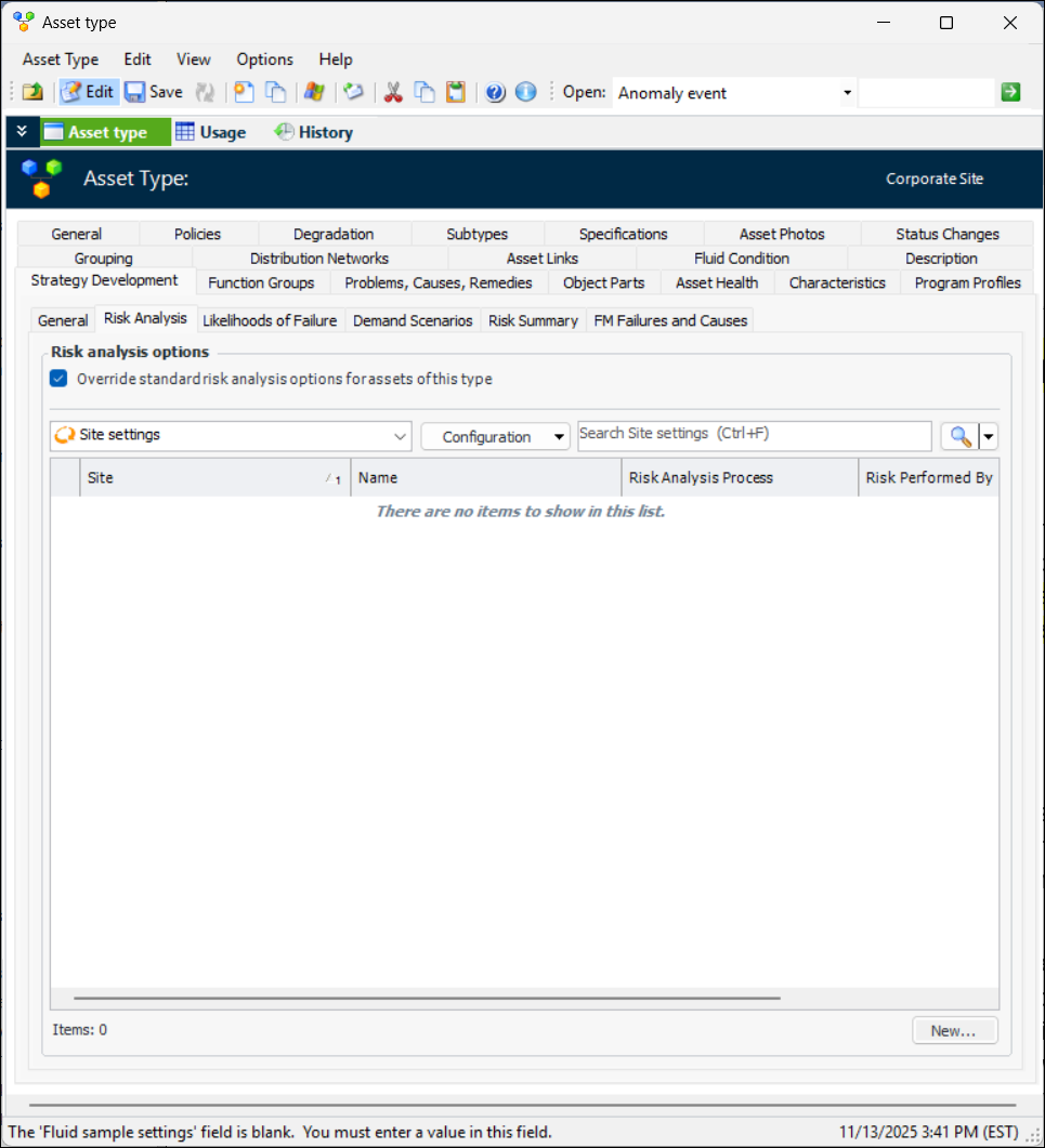 1. Open an asset type. In the Asset Type view, select the Strategy Development tab and the Risk Analysis tab.