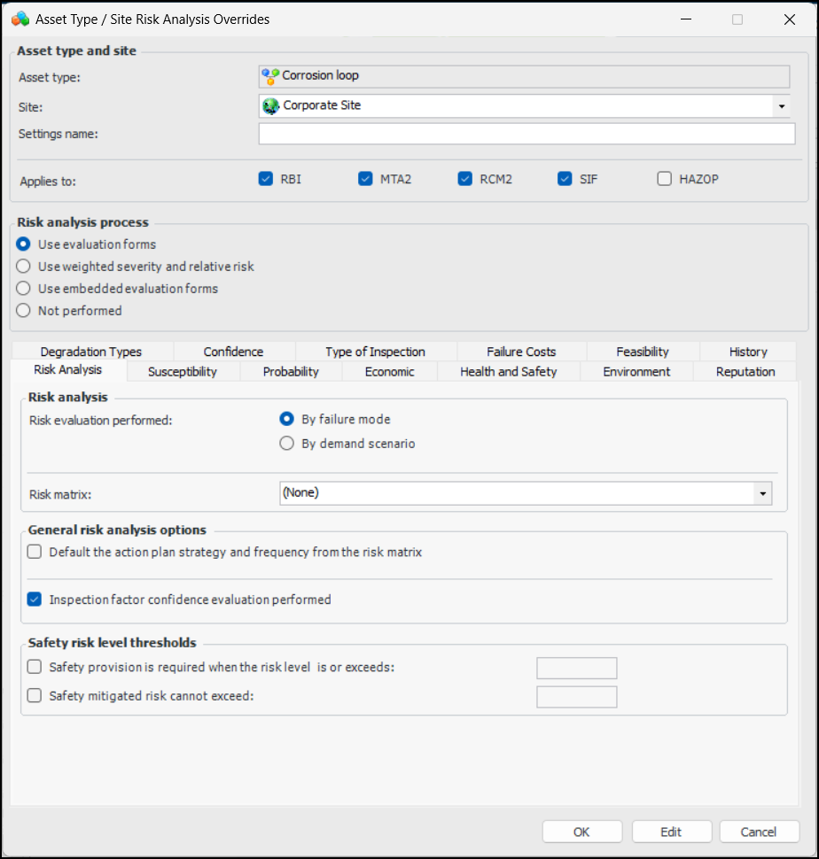 36. Click OK to save the site settings and close the dialog. The settings are listed on the Risk Analysis tab.If the risk analysis options support demand scenario analysis, see To Select Likelihoods of Failure and Demand Scenarios.To Select Likelihoods of Failure and Demand Scenarios