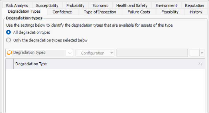 27. To limit the degradation types available for an asset based on its asset type, click Only the degradation types selected below. The table is populated with degradation types. Select the appropriate types.