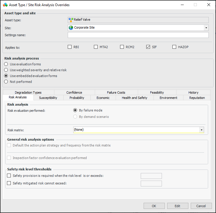 2. On the Asset Type / Site Risk Analysis Overrides dialog, select Use embedded evaluation forms. The dialog changes as follows: