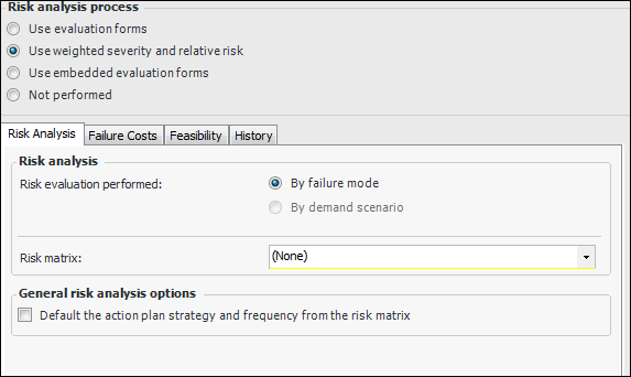 9. On the Risk Analysis tab, select whether risk analysis is performed on failure modes or on demand scenarios. If you select By demand scenario, the Demand Scenarios tab is added and the Probability tab is removed.