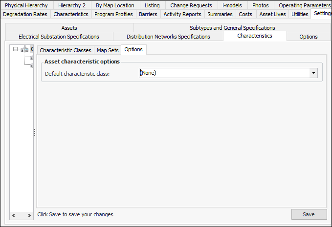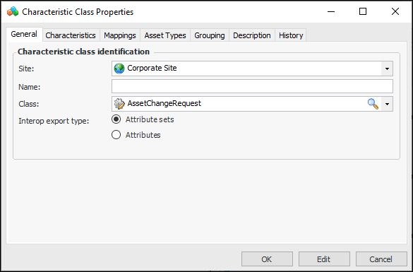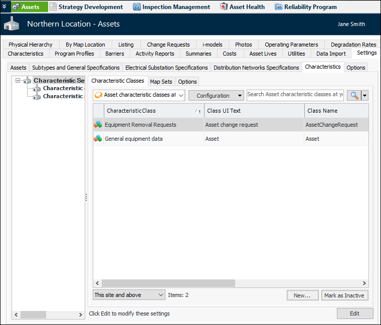 1. In the Site window, select the Assets view, the Settings tab and then the Characteristics tab. For example:By default, the Characteristic Classes tab shows characteristic classes for the enterprise based on the Asset and AssetChangeRequest classes.Tip: You can also create characteristic classes, characteristics, and map sets at the enterprise level. In the Administration menu, click Application Settings. In the Application Settings window, select the Characteristics tab.