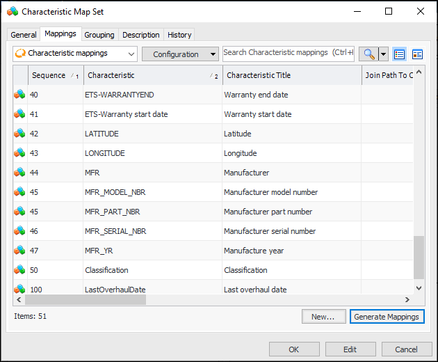 6. Select the Mappings tab and click Generate Mapping. APM creates mappings for the characteristics identified in the characteristic class. For example: