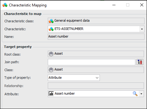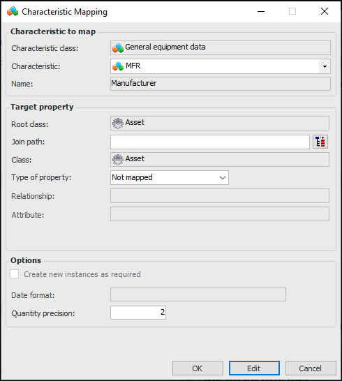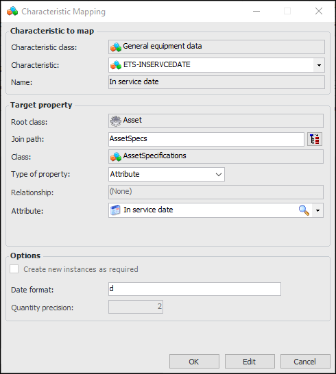 7. Open each Characteristic Mapping dialog and click Edit. For example:Asset Number