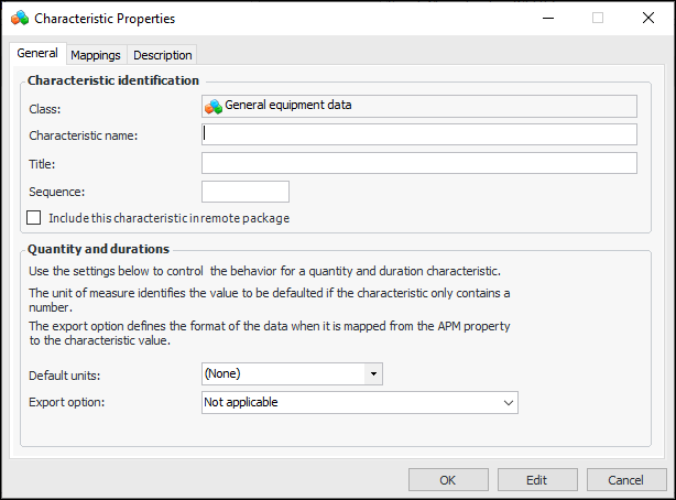 12. In the Quantity and durations area, you can set options that determine how exported information is presented in the CMMS characteristic: