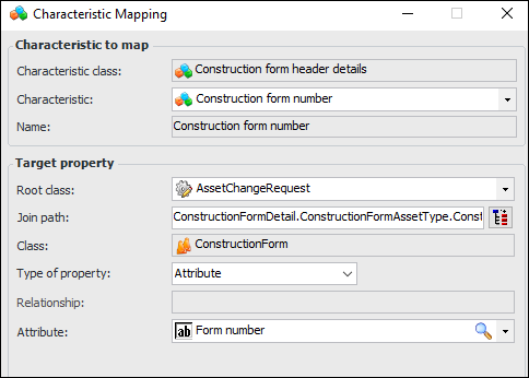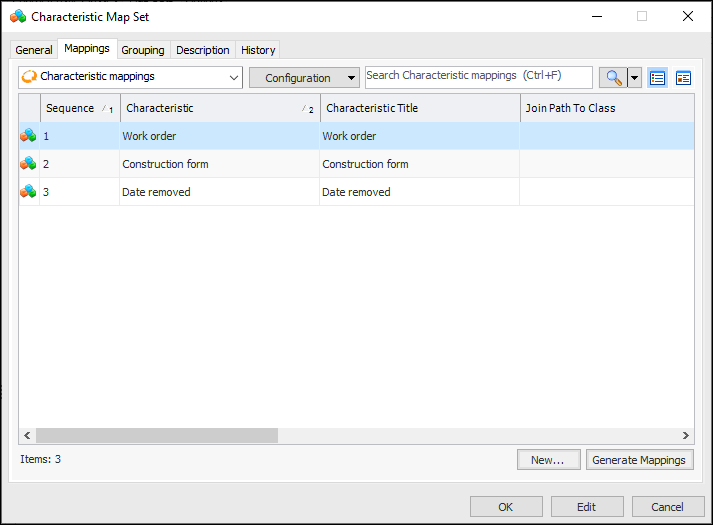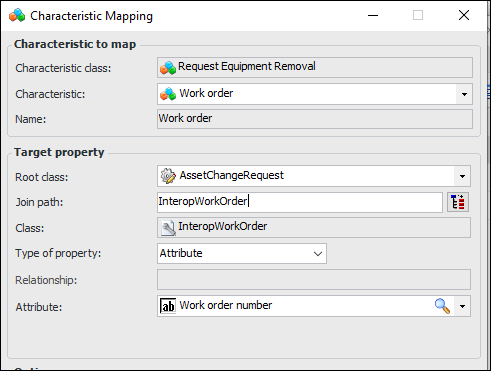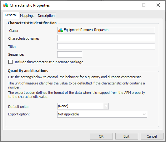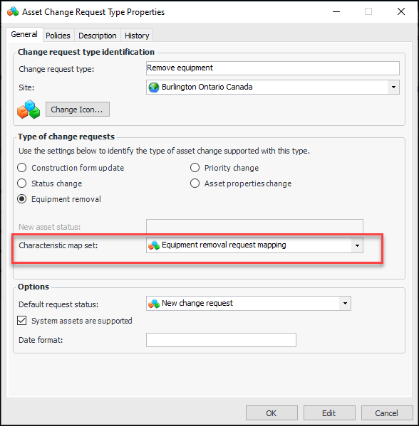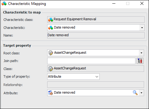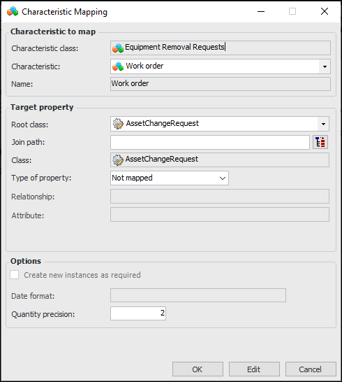 7. Open each Characteristic Mapping dialog and click Edit. For example:Date removed (Remove equipment change request)