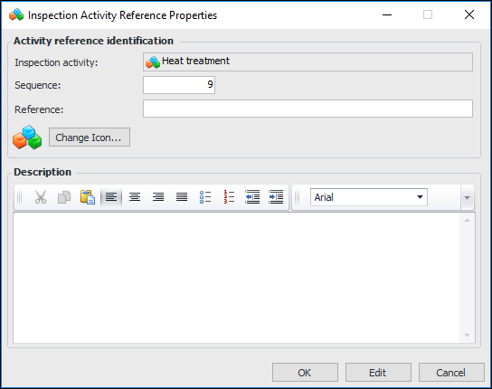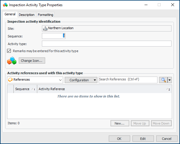 8. Identify references that will be available for selection in activities. Click New. The Inspection Activity Reference Properties dialog appears. For example: