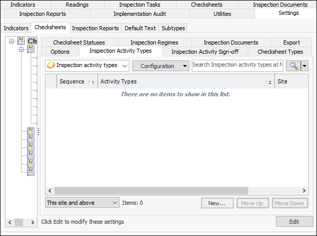 1. From the Site window, select the Inspection Management view, the Settings tab, and then the Checksheets tab. Select the Checksheet Settings node in the tree.Tip: You can also click the Administration menu, Inspection Management Settings, and then Checksheet Settings. The Checksheet Settings window appears.