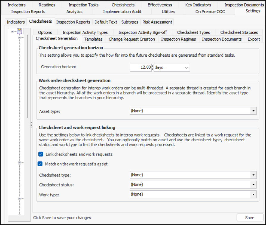 1. From the Site window, select the Inspection Management view, the Settings tab, and then the Checksheets tab. Select the Checksheet Settings node in the tree.Tip: You can also click the Administration menu, Inspection Management Settings, and then Checksheet Settings. The Checksheet Settings window appears.