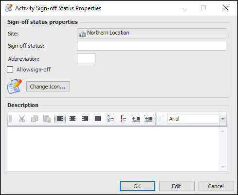 3. Click New. The Activity Sign-off Status Properties dialog appears: