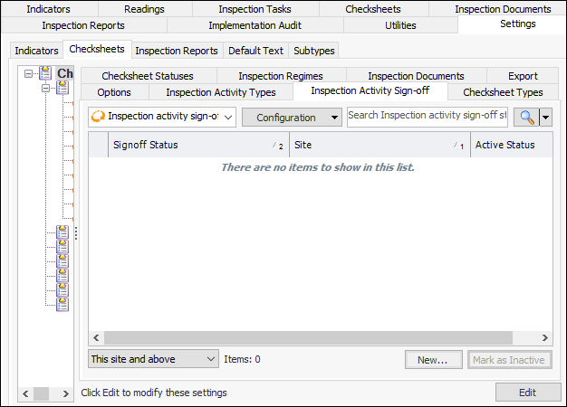 2. Select the Inspection Activity Sign-off tab.Tip: You can deactivate a sign-off status, for example, while it is being developed. Select the status in the list and click Mark as Inactive. In the dialog that appears, you can enter an explanation for the change and click OK. Click OK to close the confirmation message that appears. The status is displayed as struck-through in the list and it will not appear in MRI checksheets. To reactive a status, select it and click Mark as Active.