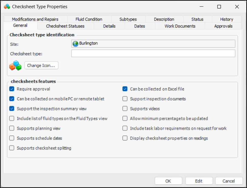 Inspection activity types must already be defined before you can add them to a checksheet type. For more information, see Setting up Inspection Activity Types.You can use checksheet type and checksheet statuses to control collection methods and to automatically mark checksheets as ready to be downloaded to APM Remote or APM Mobile Inspections and/or as ready to be exported to Excel®. For example, an organization might require that an inspection plan be reviewed and validated before the checksheets can be downloaded to mobile devices for readings to be taken. In this case, you would enable the Can be collected on mobile PC or remote tablet option on the checksheet type. Then control when the download is permitted to occur using checksheet statuses.To Set up a Checksheet Type