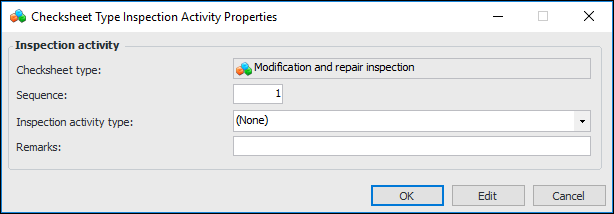 • Click New to add individual activity types. The Checksheet Type Inspection Activity Properties dialog appears. For example:Using this dialog, you can set the sequence number, select an activity type, and add remarks. Click OK to close the dialog and add the activity type to the table.