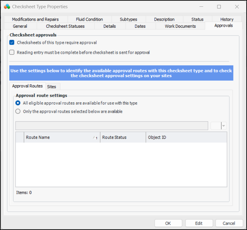 24. You can define the available approval routes by checksheet type. This allows separate routes to be defined for maintenance and construction inspections, for example. To restrict checksheets of this type to specific approval routes, select Only the approval routes selected below are available. Then select the routes in the list of available routes that appears.