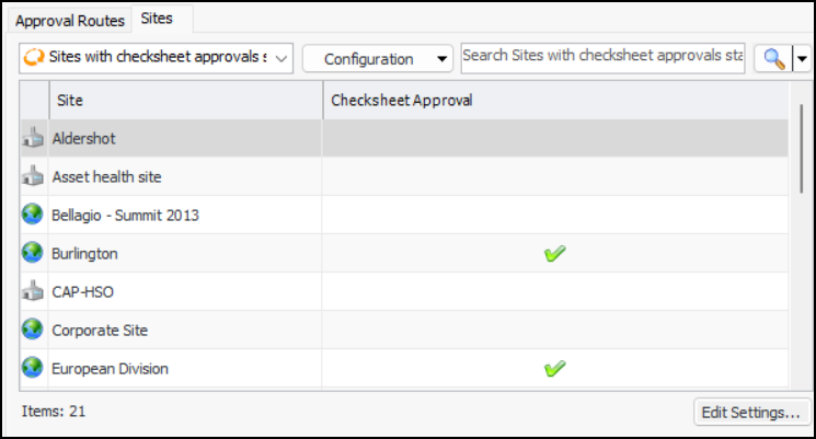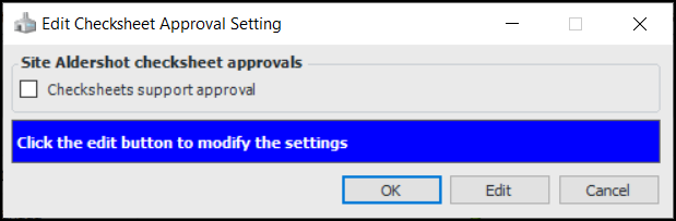 26. If you wish to turn on checksheet approval for a site, select it in the table and click Edit Settings. The Edit Checksheet Approval Setting dialog appears:
