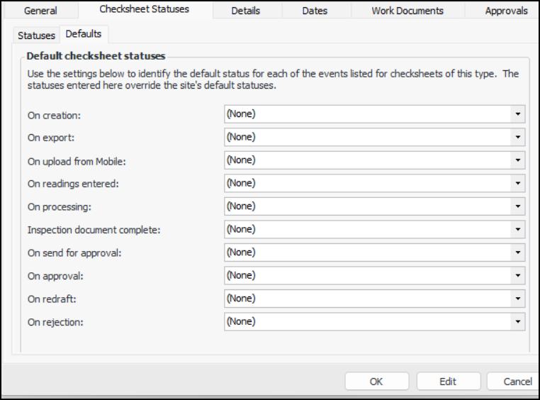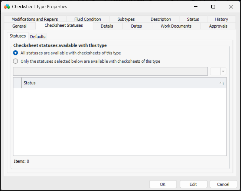 8. By default, all checksheet statuses are available for checksheets of the current type. You can restrict statuses by selecting Only the statuses selected below. The checksheet statuses for the site are listed, and you can select the appropriate ones for this checksheet type.